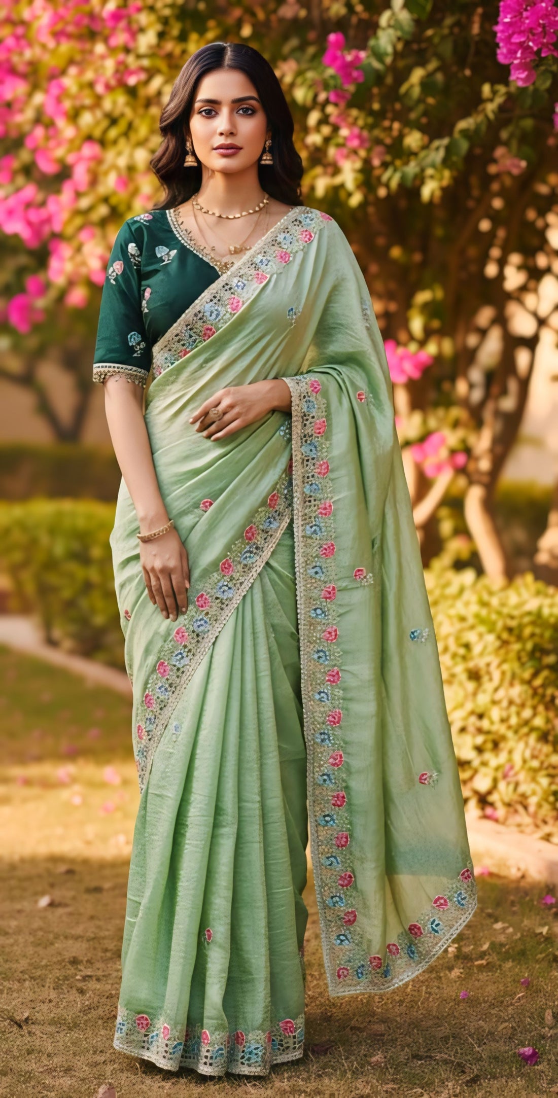 Elegant Gorgeous Light Pista Green Jimichu Silk Saree with Embroidery Work & Unstitched Blouse