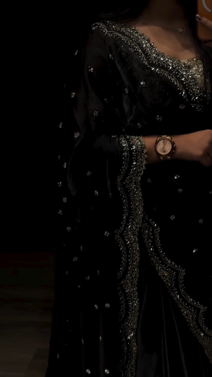 A midnight black saree adorned with delicate scattered motifs and an intricately crafted Swarovski and beadwork embellished...