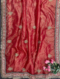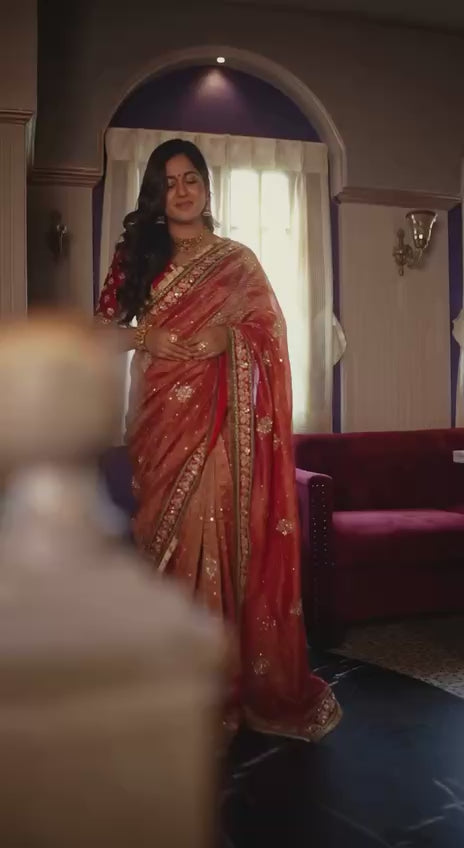 Elegant Banarasi silk saree with intricate golden embroidery and sequin work, paired with a matching blouse, perfect for festive and traditional occasions.