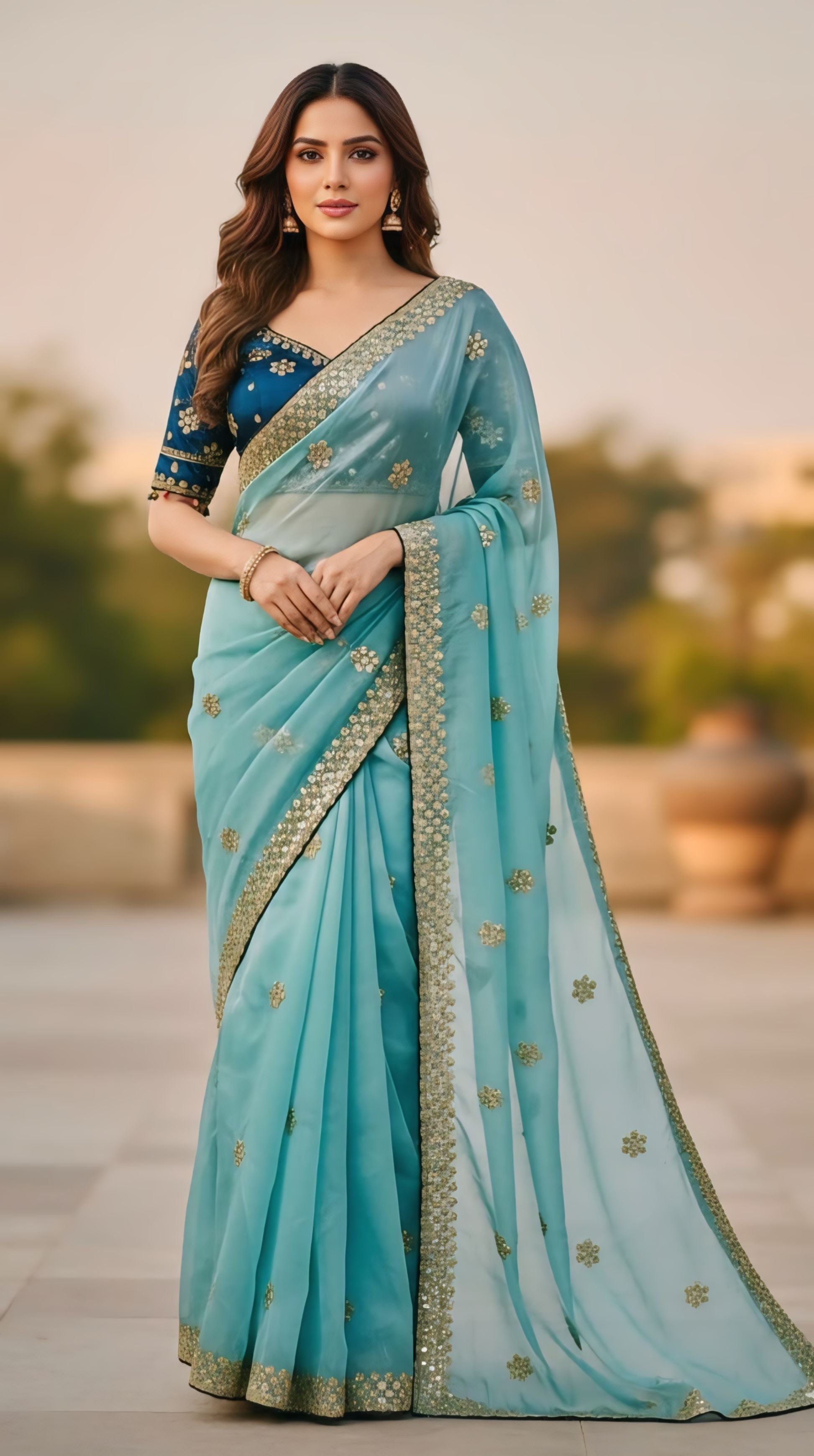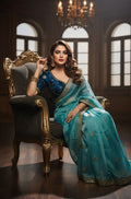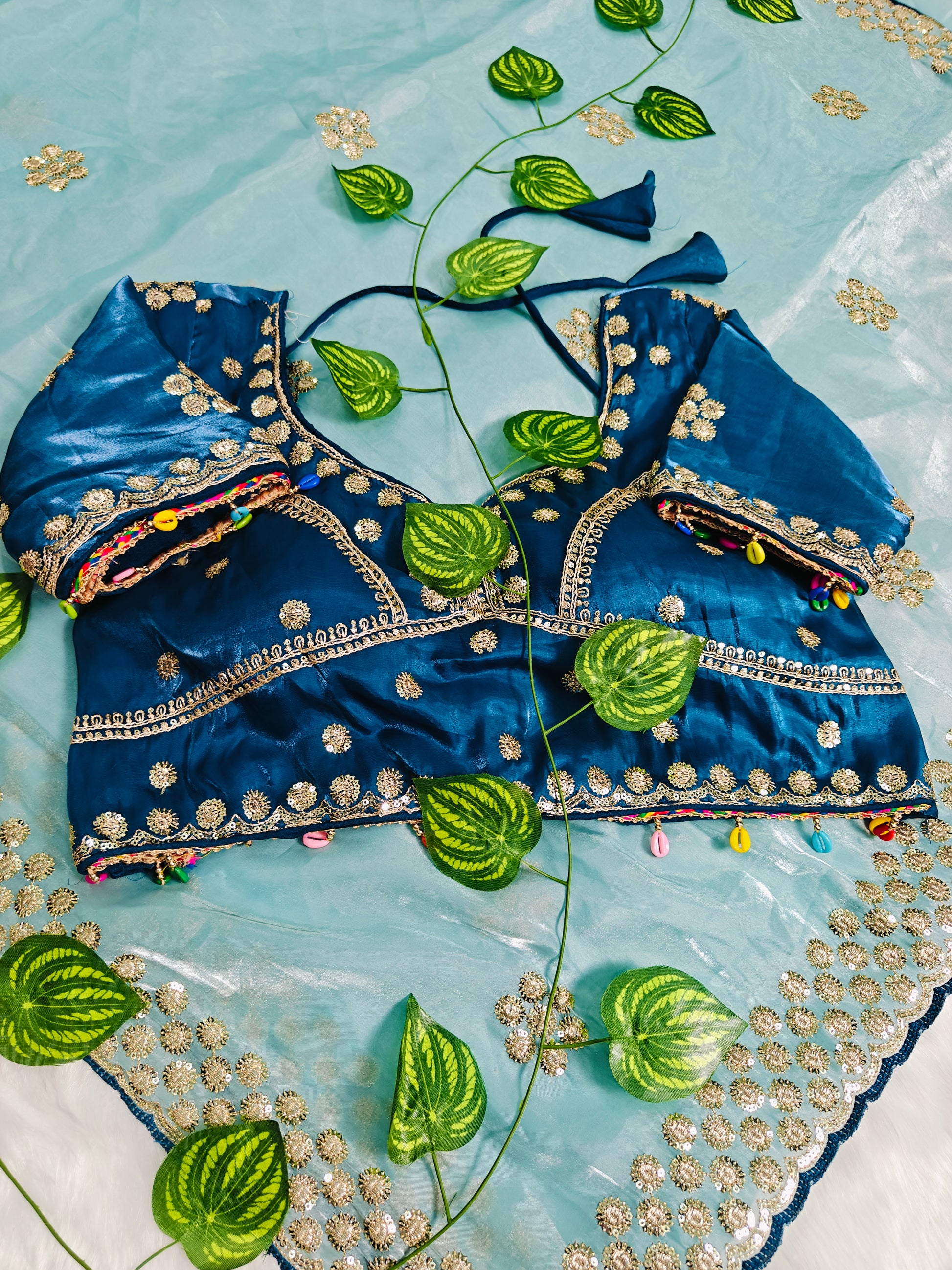 Designer Aqua Blue Jimichu Silk Party Wear Saree with Stitched Blouse