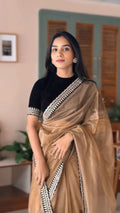 Designer Golden Beige Tweel Net Silk Party Wear Saree with Unstitched Blouse