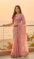 Elegant Pastel Peach-Pink party wear saree in soft Jimichu Silk with Multi Embroidery and Sequence Work. Features cut-work full border, designer pallu, and full body butti. Comes with a Stitched Contrast Blouse.