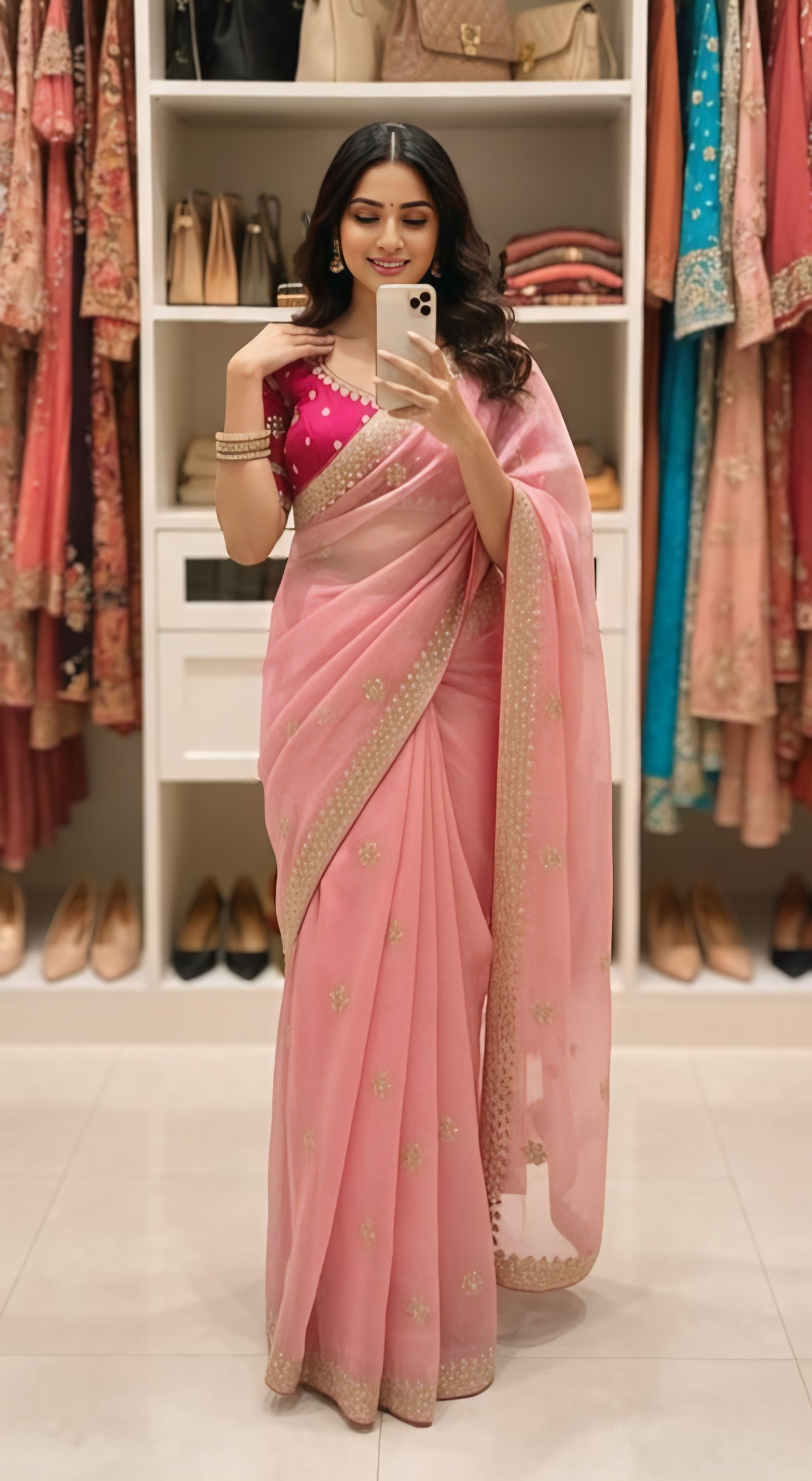 Designer Pastel Peach-Pink Jimichu Silk Party Wear Saree with Stitched Blouse