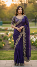 Rich Purple saree crafted in soft Fendy Silk, featuring multi-color and Sequence Embroidery with elegant cutwork border, designer pallu, and full-body sequence butti work. Comes with a Stitched Matching Embroidered Blouse with lace detailing on sleeves.
