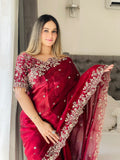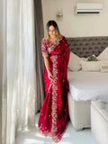 Designer Red Fendy Silk Party Wear Saree with Stitched Embroidered Blouse