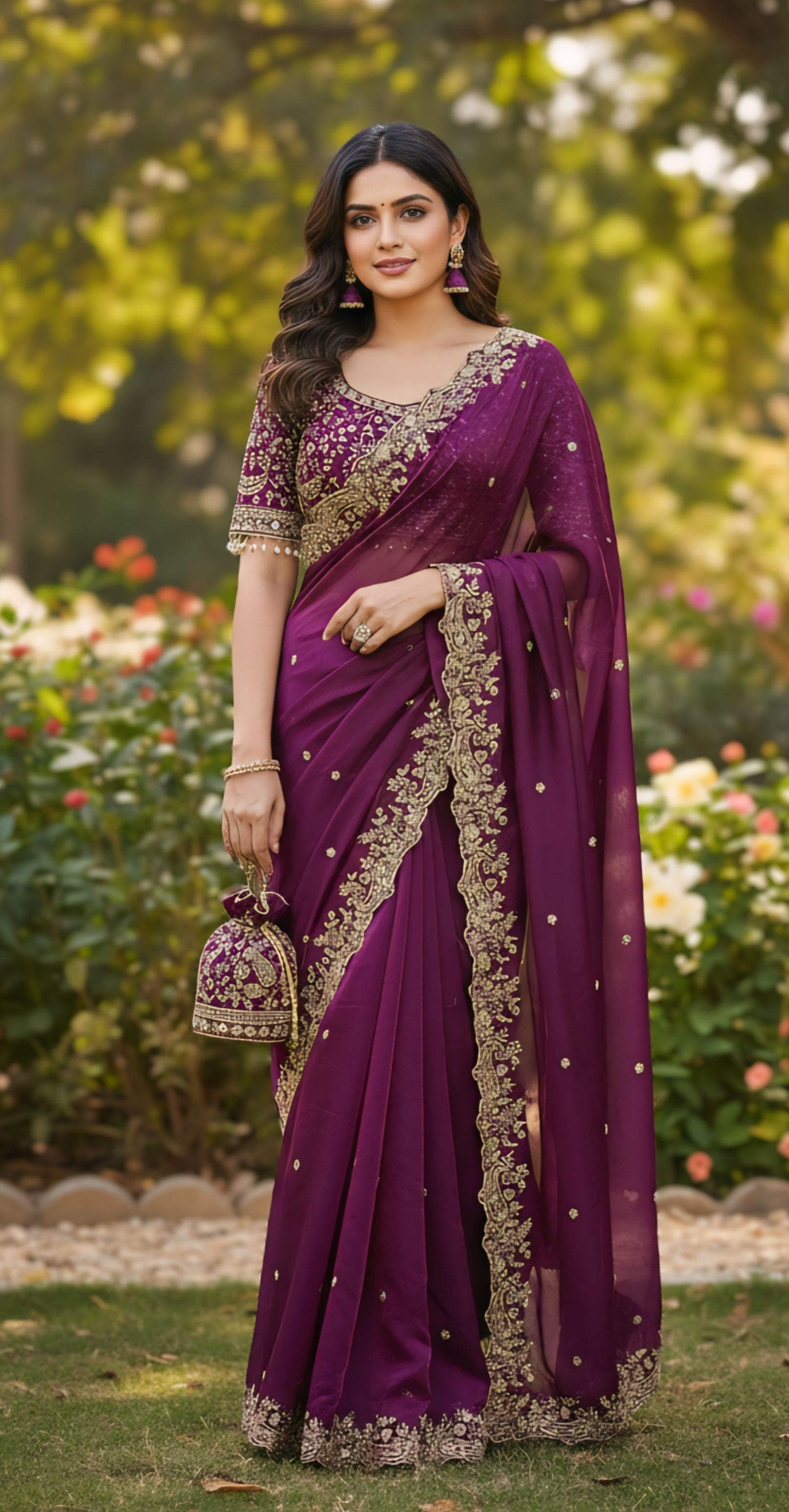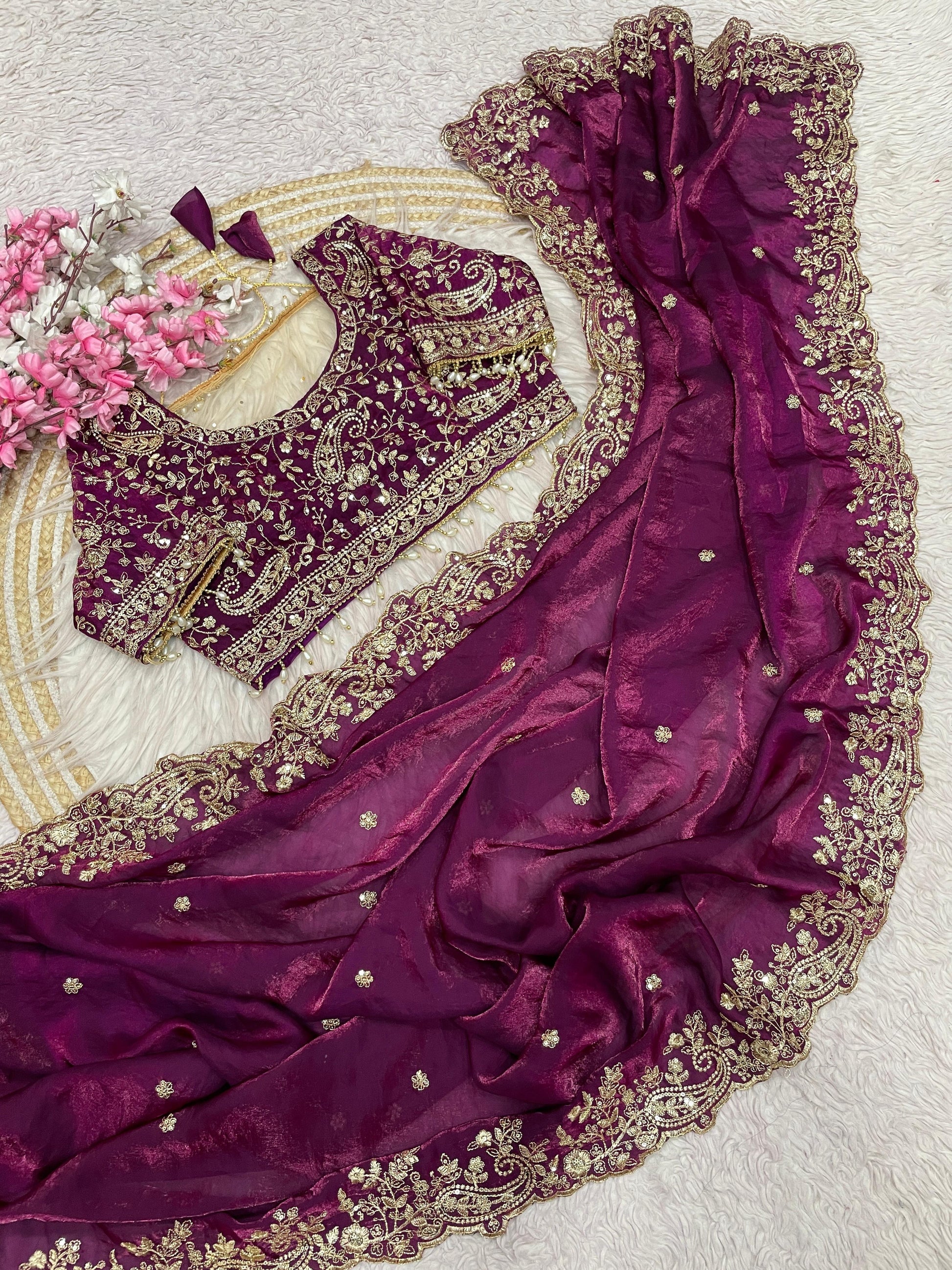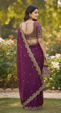 Rich Wine saree crafted in soft Fendy Silk, featuring multi-color and Sequence Embroidery with elegant cutwork border, designer pallu, and full-body sequence butti work. Comes with a Stitched Matching Embroidered Blouse with lace detailing on sleeves.