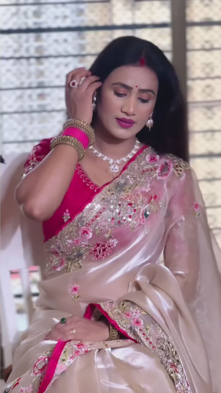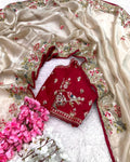 Beautiful Beige Gold soft Jimichu Silk saree featuring elegant Multi Embroidery, Sequence and Coding work with cutwork border and rich pallu. Piping detail enhances the graceful look. Comes with contrast Unstitched Embroidered Blouse, perfect for festive and party wear.