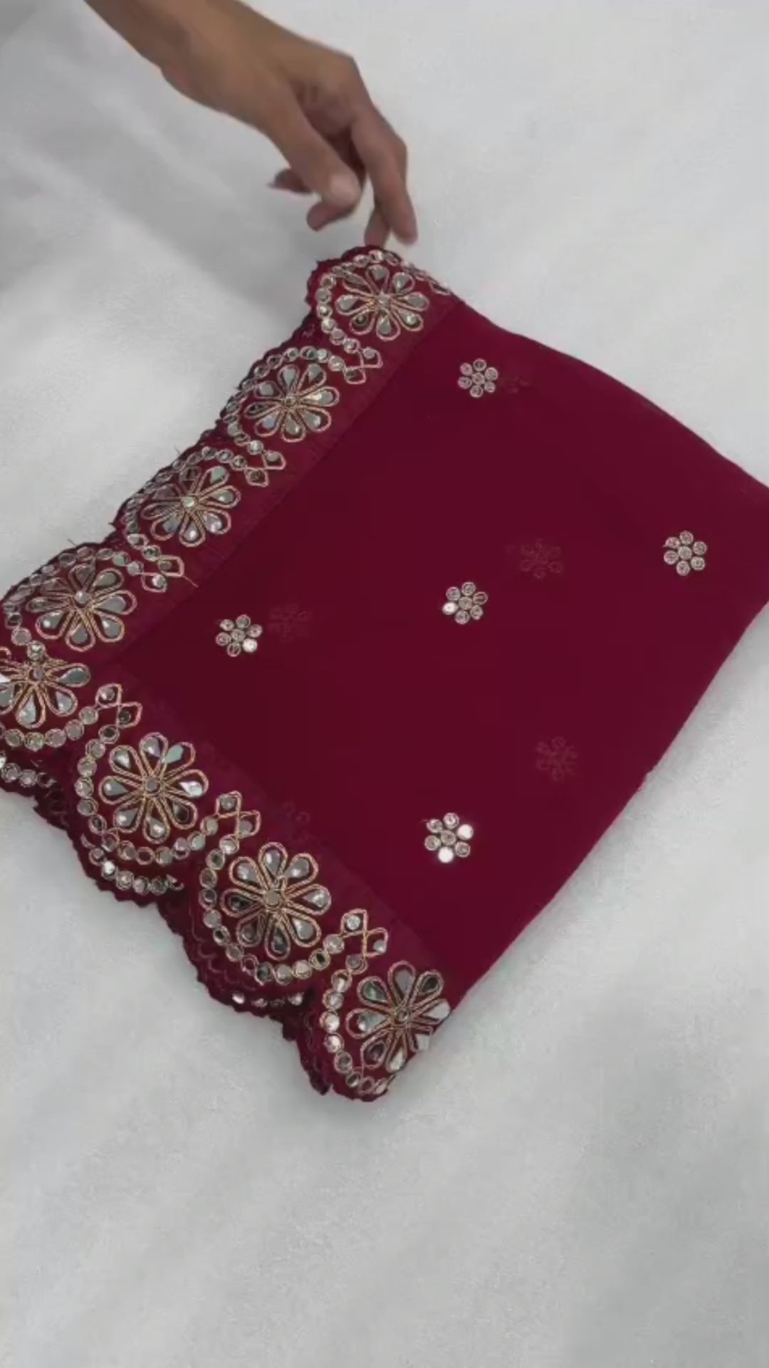 Beautiful Maroon party wear saree crafted in soft Georgette Silk, featuring Multi-color embroidery, sequence, and real mirror work with a rich border and elegant pallu. Comes with a Fully Stitched Matching Embroidered Blouse with mirror and sequence work on body and sleeves.