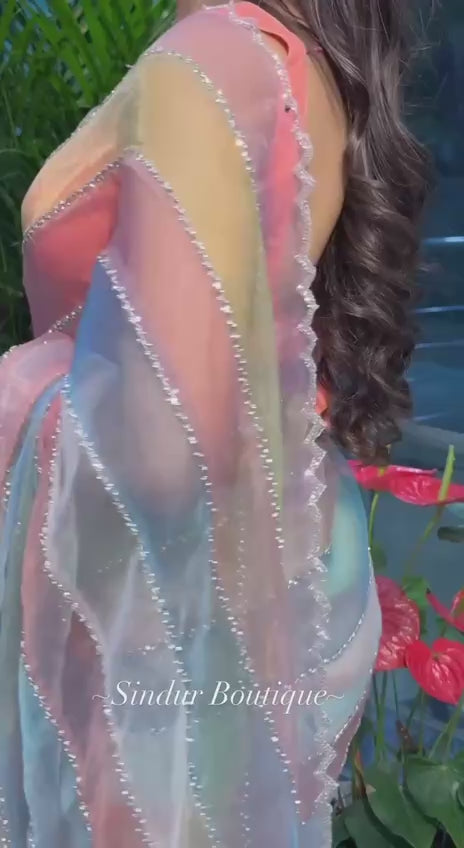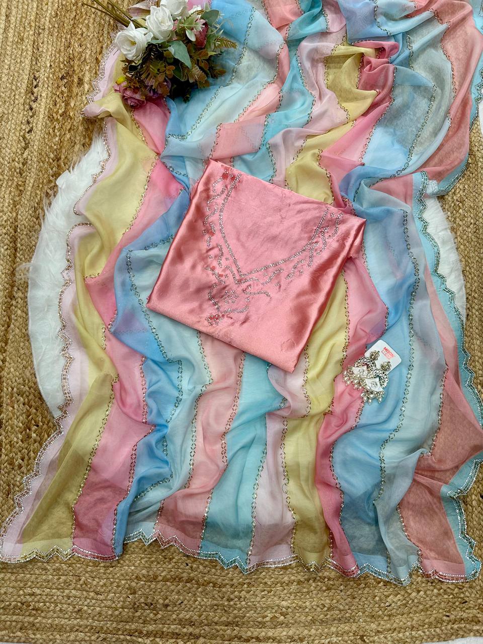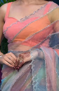 Pastel Multicolour Tebby Silk Saree with Hotfix Diamond Work Blouse Piece