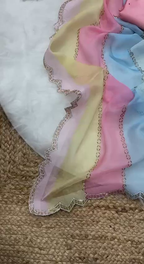Beautiful Multicolor party wear saree crafted in Soft Tebby silk, featuring hot fix val and diamond work on lining and border with cut work . Comes with a soft satin with hot fix diamond work