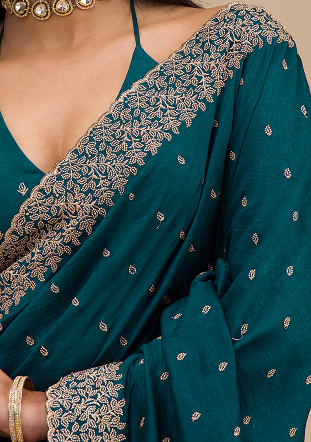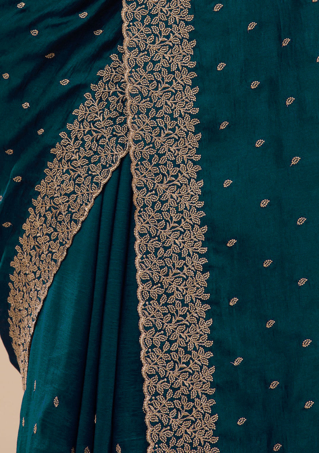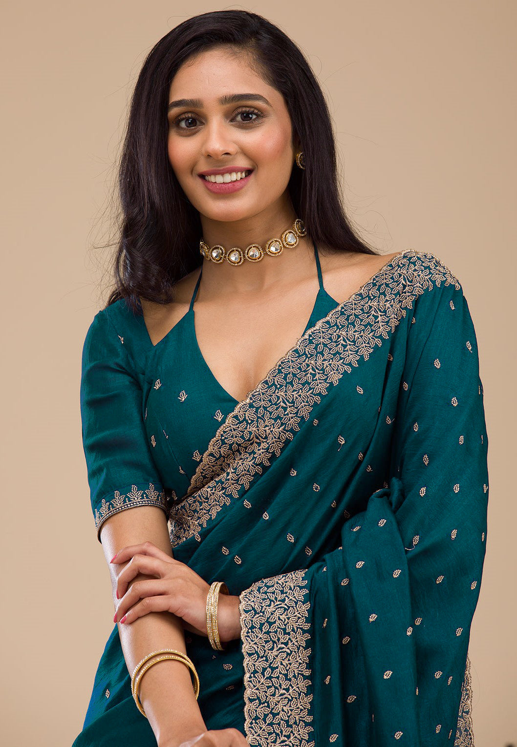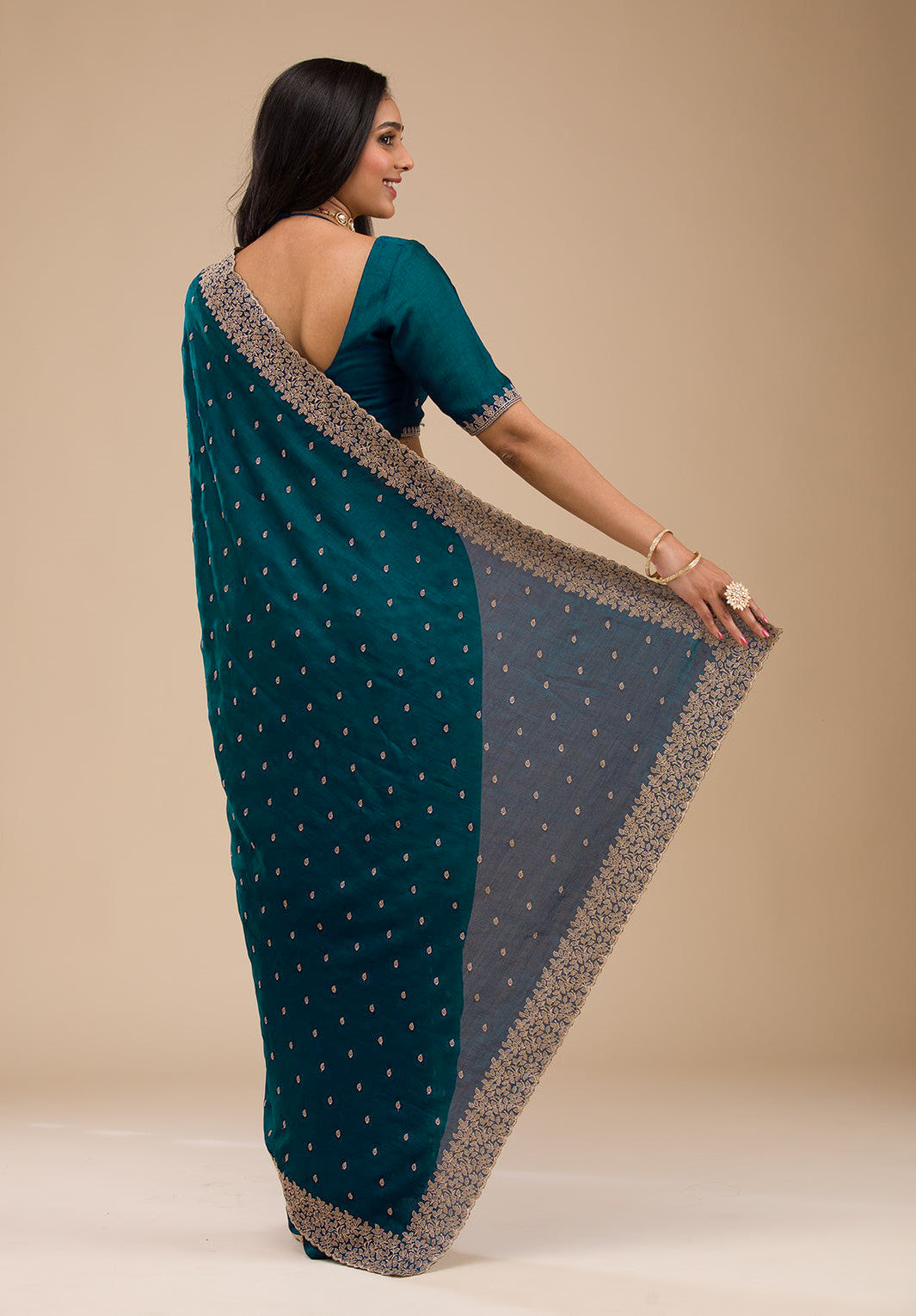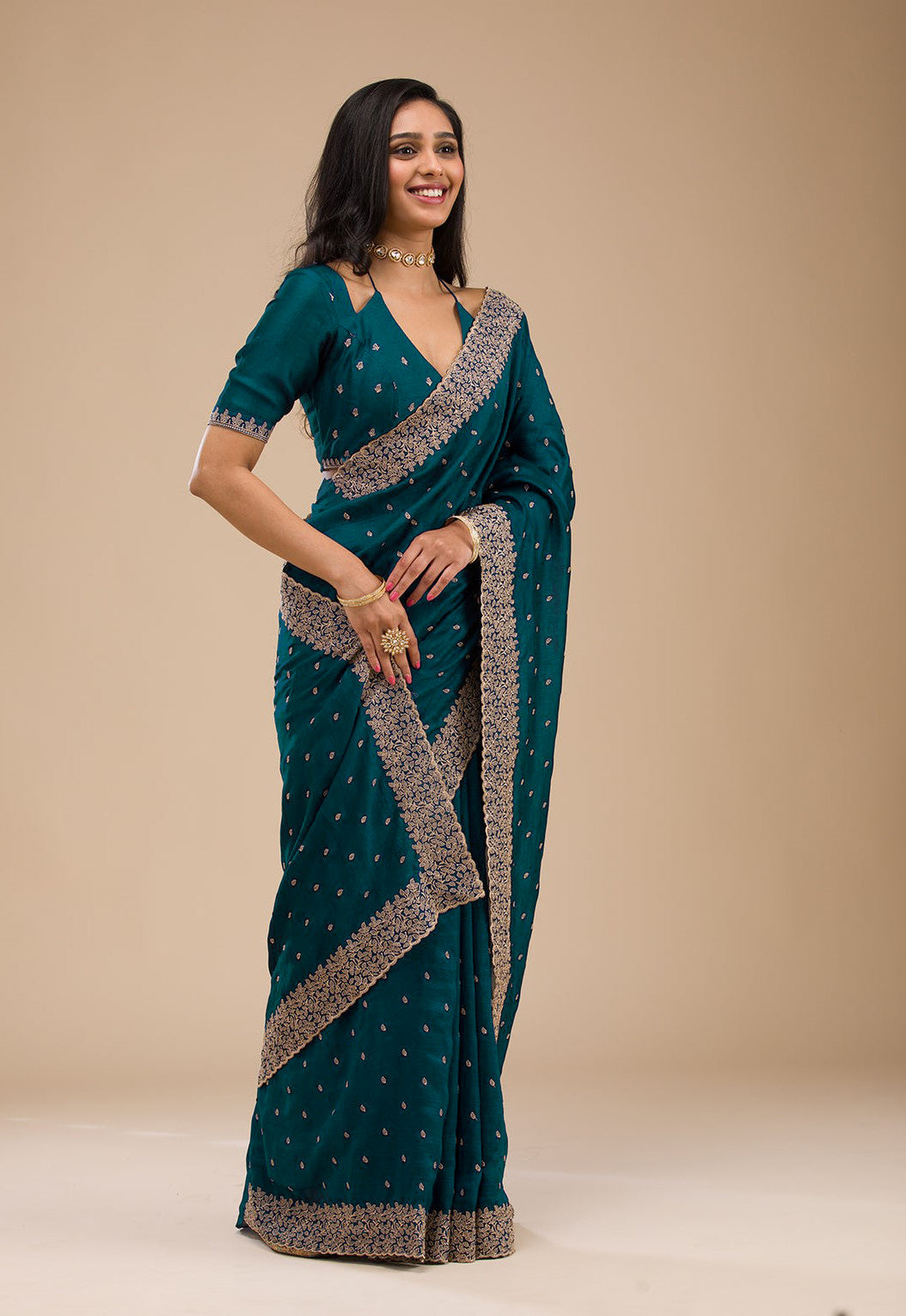 Modern take on traditional zari work, with a minimalist, pan-Indian appeal Rose gold zari embroidery adds a luxe metallic touch Elegant buti and border combination keeps the look refined Chinon fabric offers comfort with richness Ideal for both traditional and modern settings