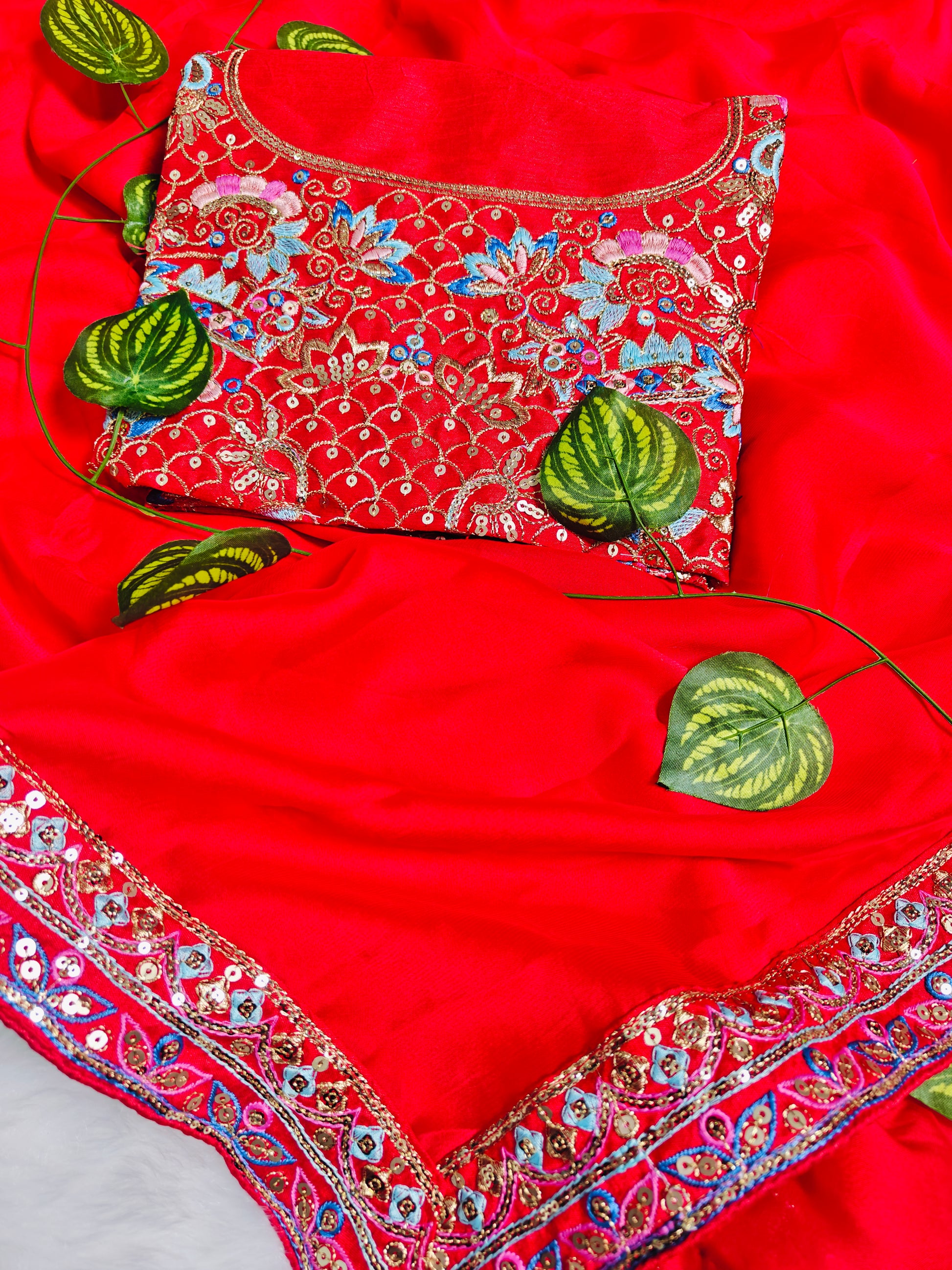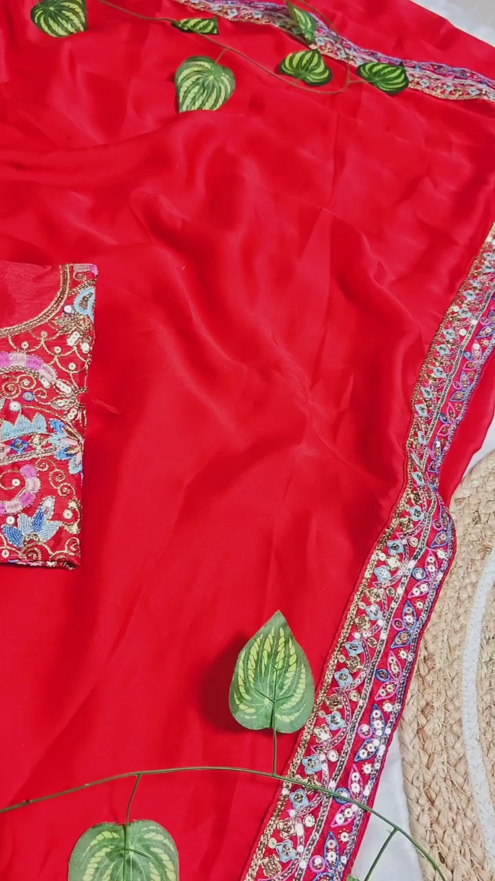 Graceful Red Rangoli Silk saree with Multi-Sequence Embroidery, lace border, piping detail, and designer pallu. Comes with an Unstitched Matching Embroidered Blouse.