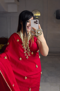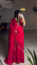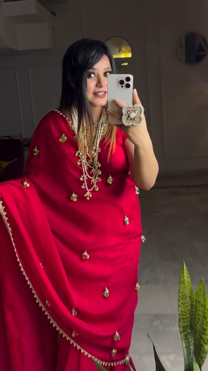 A stunning crimson pure crepe silk saree featuring delicate gold latkan embellishments that create a soft ghungroo like sound with movement. The fluid drape and luxurious texture make it a graceful choice for festive celebrations, weddings, and evening occasions.