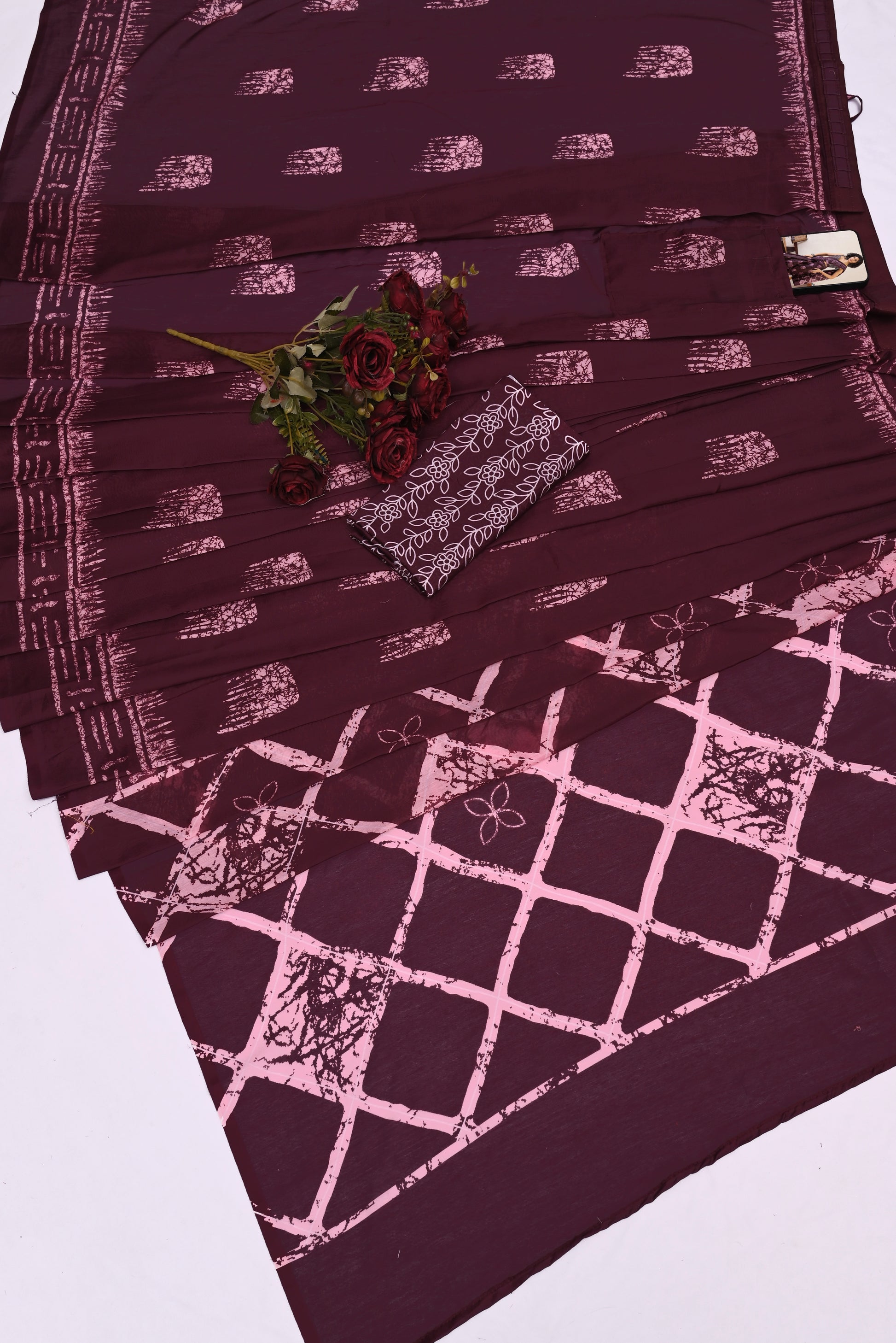 Maroon Ready to Wear Mul Mul Cotton Saree with Batik Print Work with blouse