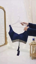 A Lightweight Soft Organza Saree With Elegant Blue Stripes Embroidery Lace Border , Paired With A Sleeveless Tie-up Blouse. Perfect For Casual Outings, Festive Events, And Summer Gatherings With A Breezy, Graceful Look