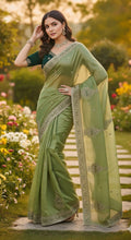 Pistachio Green Or Pastel Olive Green Fendy Chiffon Silk Saree with Sequence Butta Work Blouse