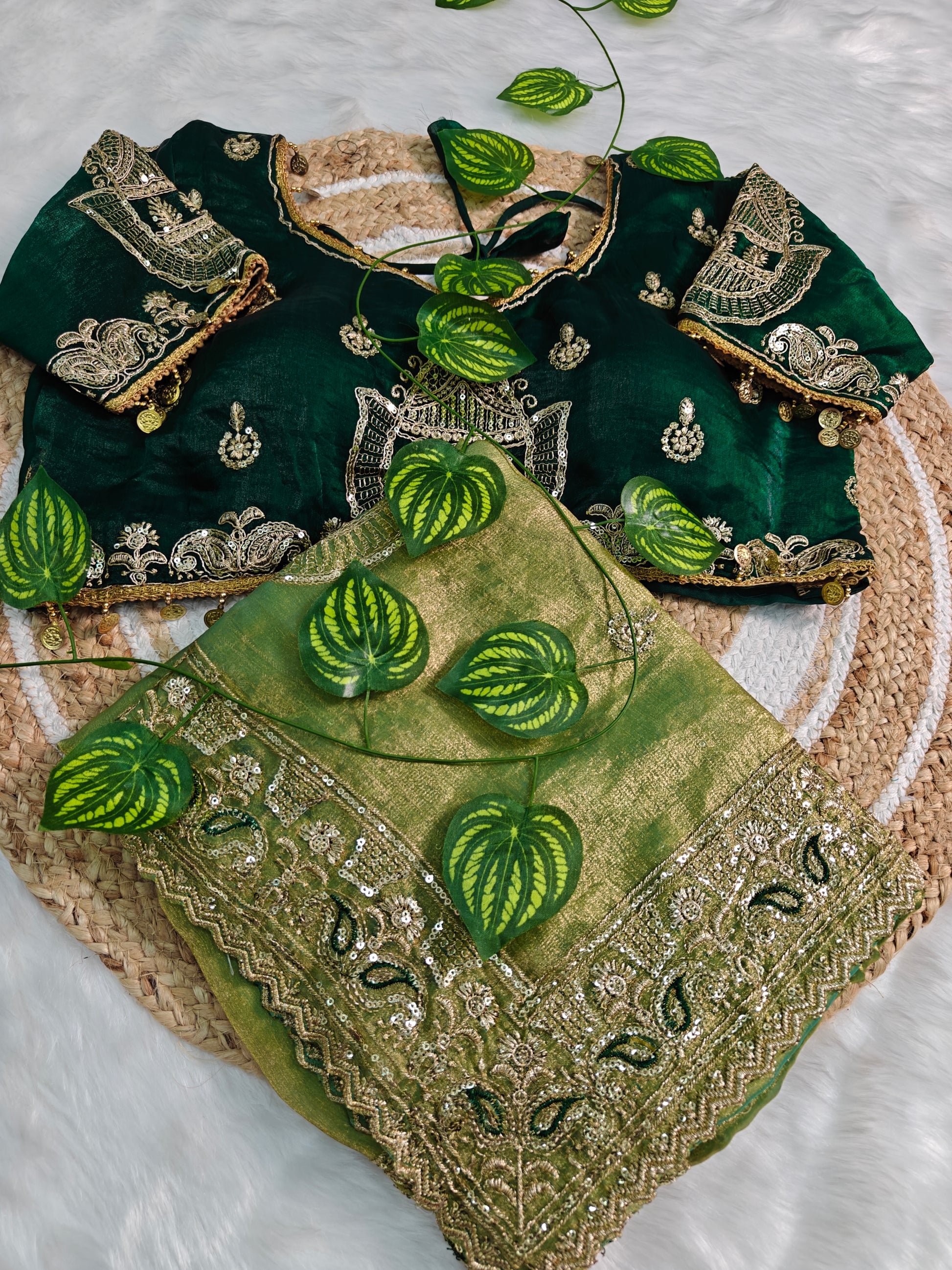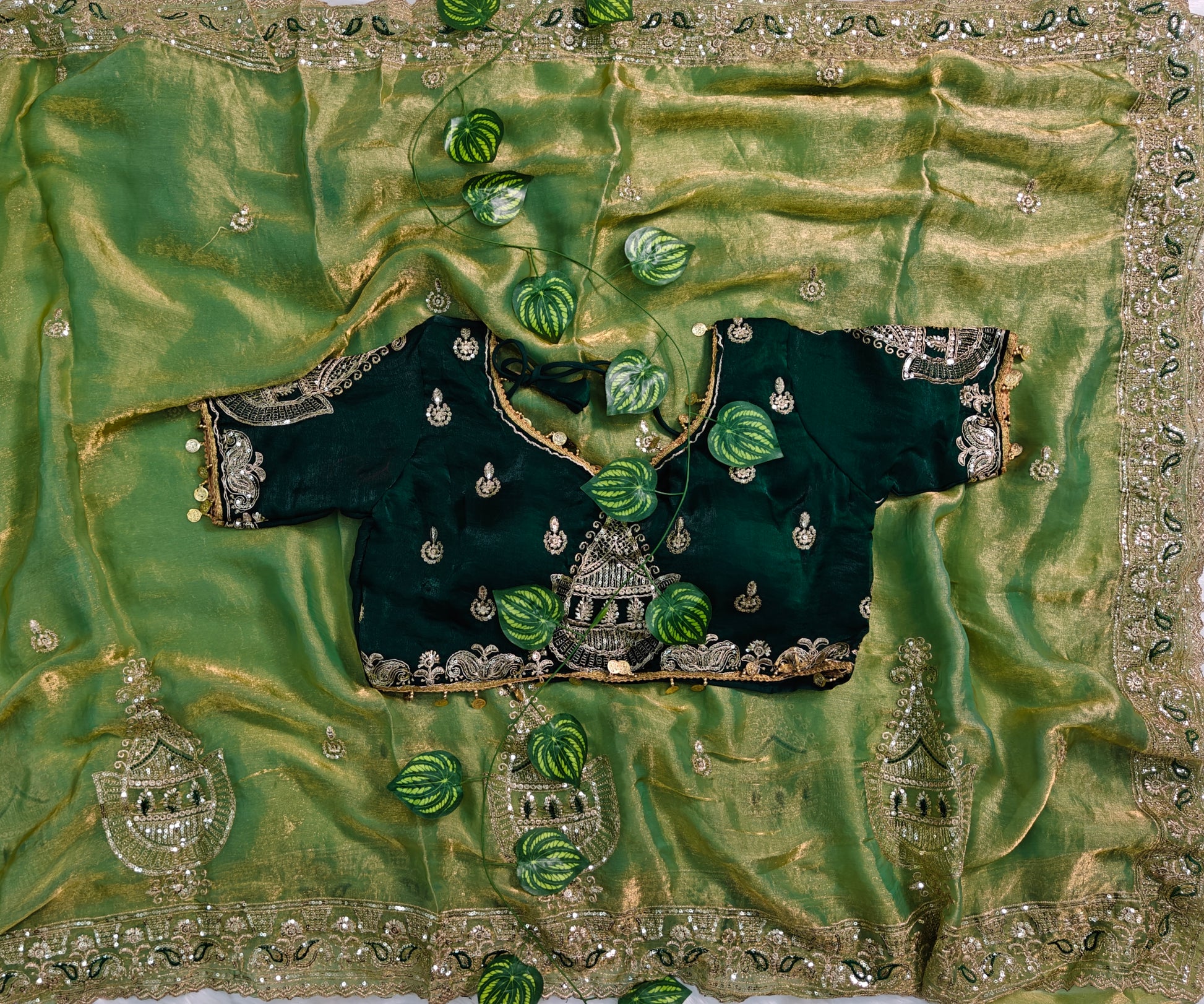 Beautiful Pistachio Green Or Pastel Olive Green soft Fendy Chiffon Silk saree featuring elegant Multi-Embroidery and Sequence work with cutwork border and rich pallu. Full body butta design adds a festive look. Comes with contrast Fully Stitched Embroidered Blouse.