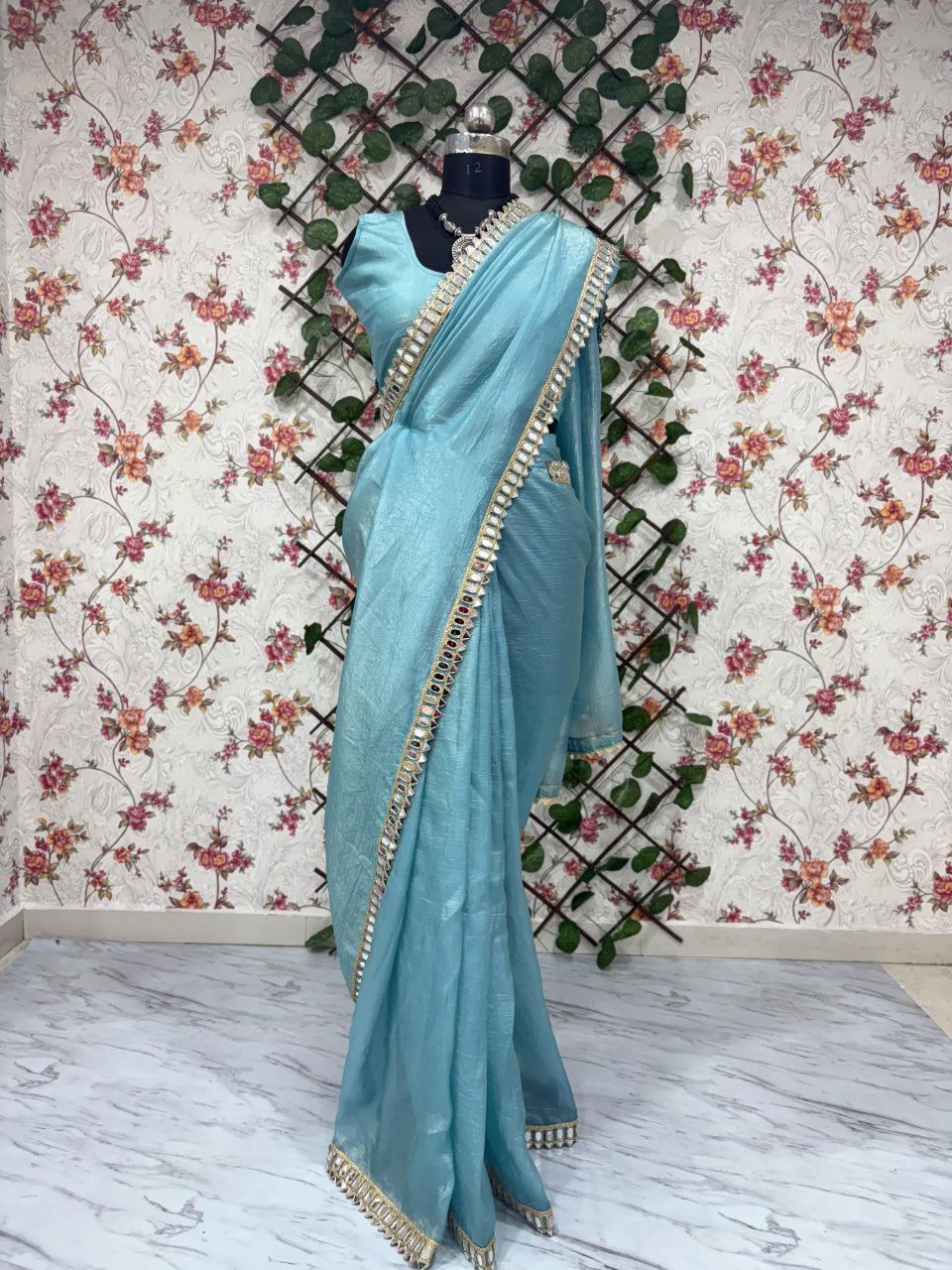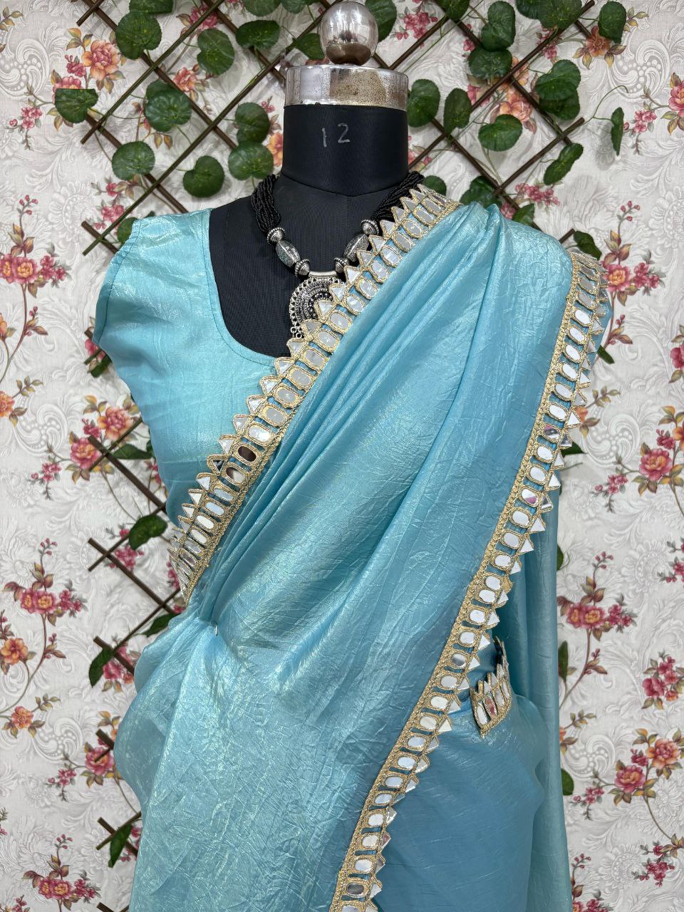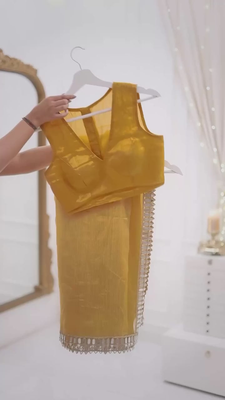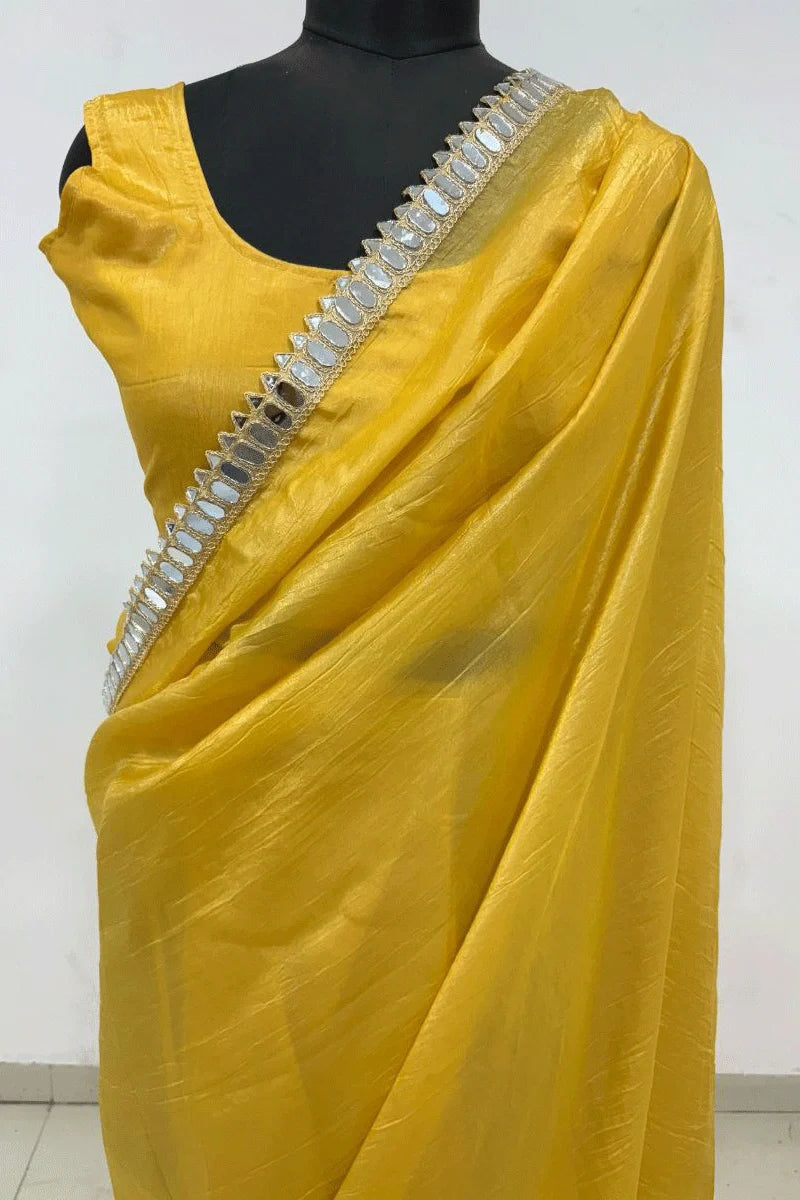 Elegant and timeless, this mustard yellow saree is crafted in a lustrous fabric with a subtle sheen. The highlight is its beautifully adorned mirror work border that adds a touch of sophistication and festive charm. Perfect for weddings, parties, and traditional occasions.