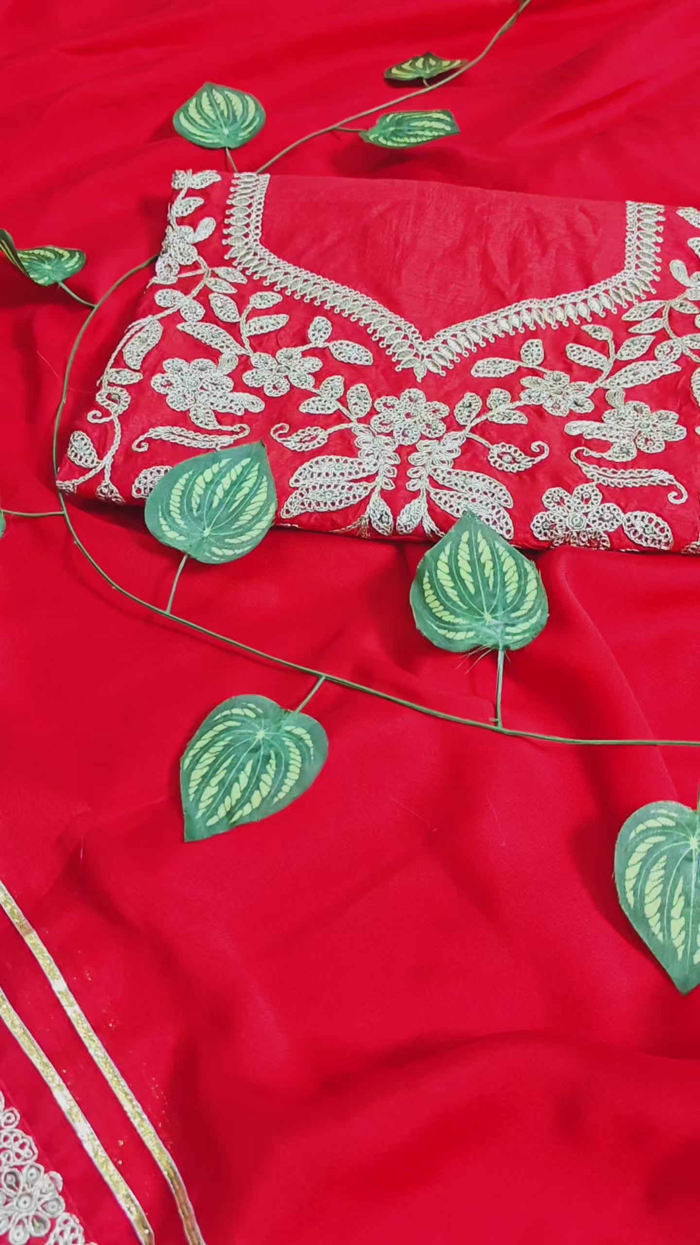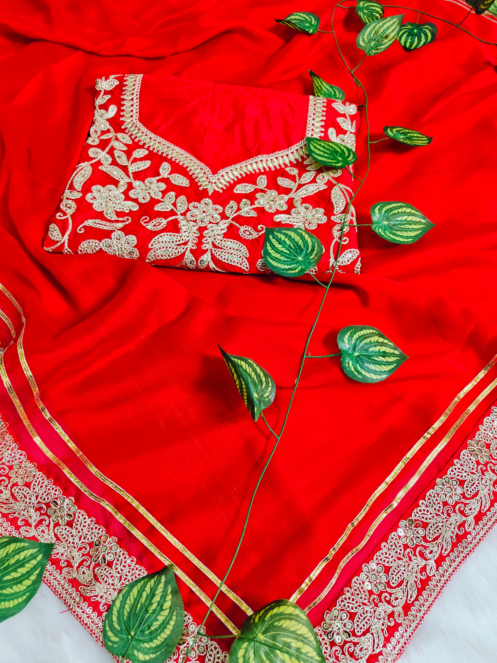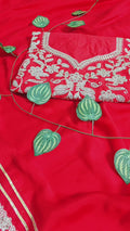 Rich Red Rangoli Silk saree with Coding Sequence Embroidery, lace border, and designer pallu. Includes Unstitched Matching Embroidered Blouse.
