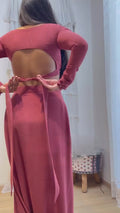This Saree Is Made Of Soft Georgette Fabric In A Rich Peach, Featuring A Plain Elegant Design. The Blouse Is Matching In Color With Full Sleeves And A Deep Neckline For A Classy Modern Look.