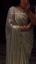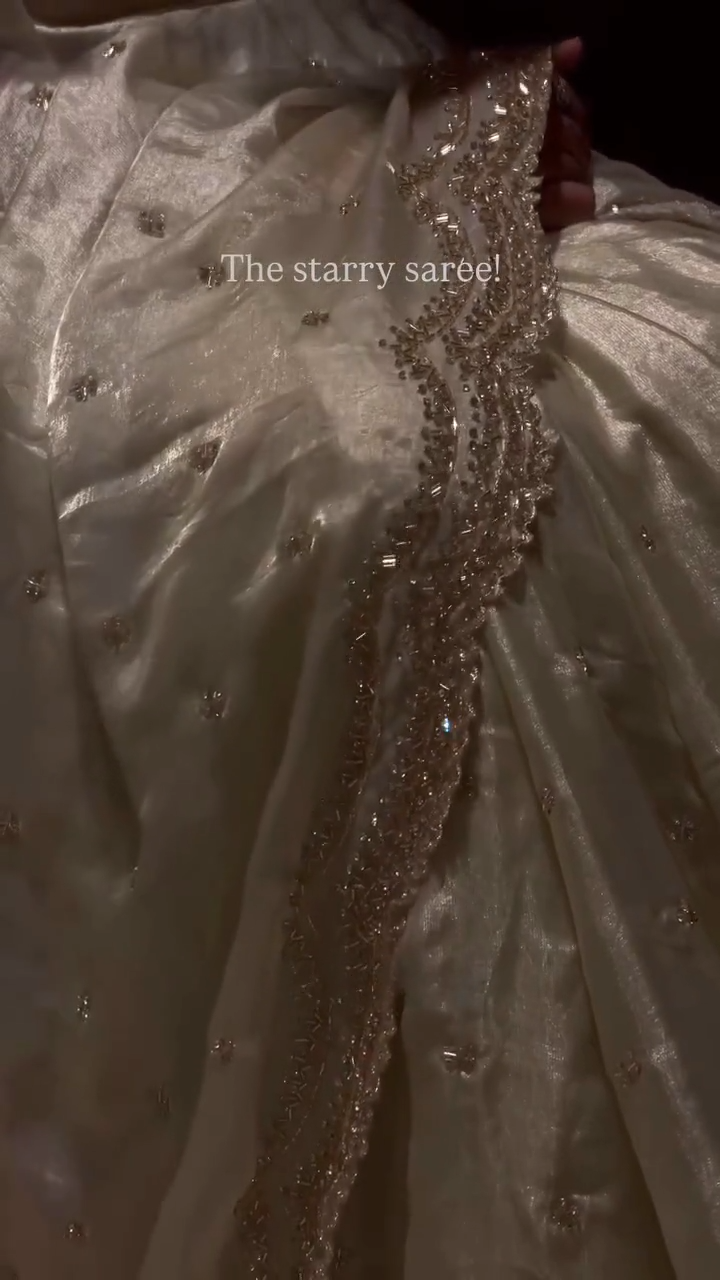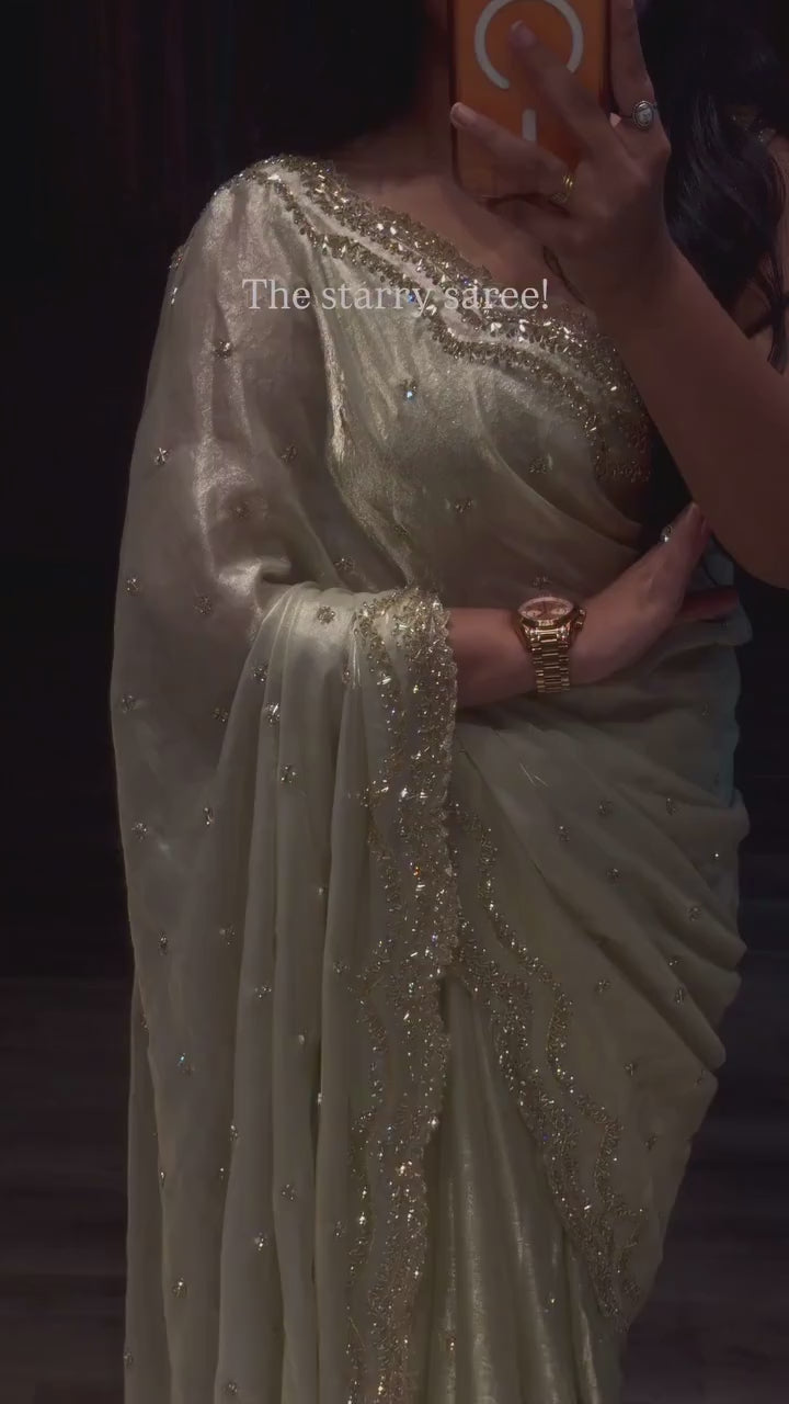 A starry white saree adorned with delicate scattered motifs and an intricately crafted Swarovski and beadwork embellished border. The rich sheen and regal drape create an elegant statement, perfect for weddings, receptions, and grand festive occasions.